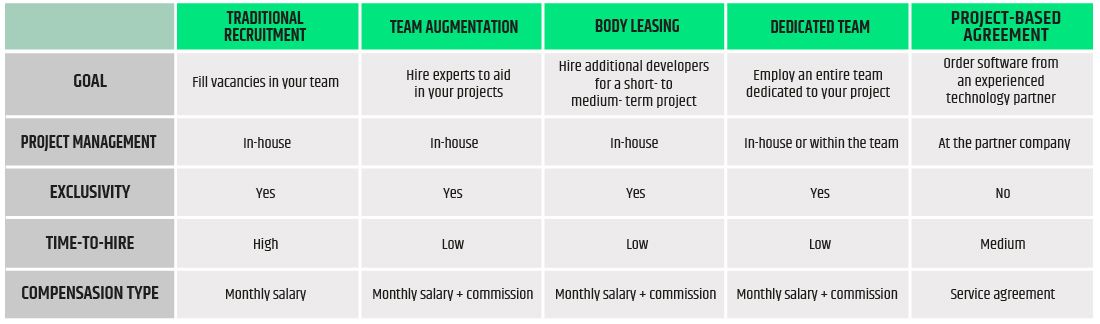 Based on the information from this comparison, you should be able to judge what software development outsourcing model fits your needs best. Consult our talent solutions website to learn more about the team augmentation and team leasing services we offer.