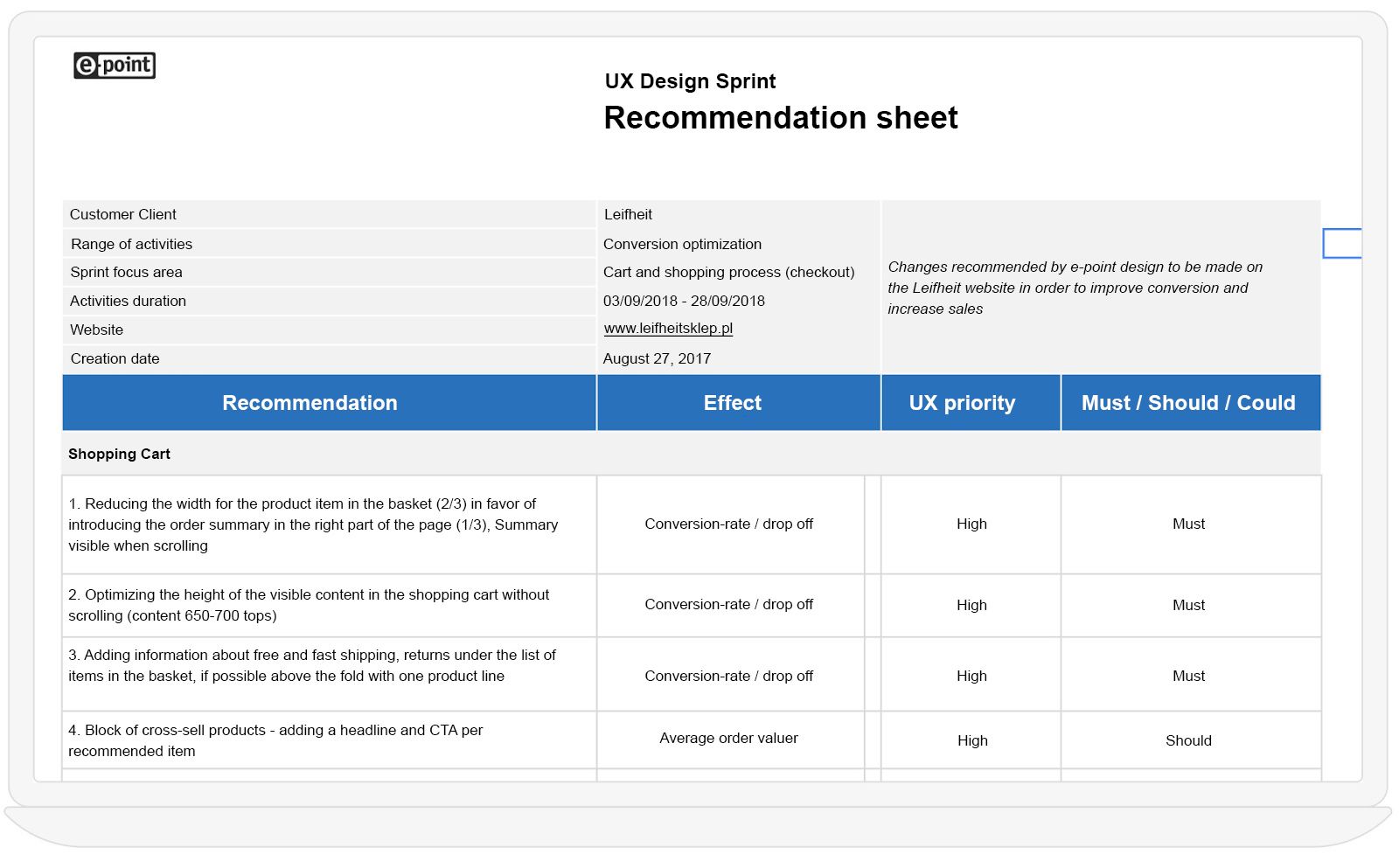 For each of the areas, a list of recommended UX changes was prepared. In cooperation with the client and the technical team, we identified priorities using the widely-recognized MoSCoW method.