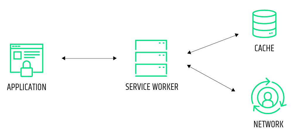 Service Worker is a JS script (standard language for web applications, in addition to supporting HTML and CSS), which mediates between the application and the browser. It can collect information about the client, stores reusable data on the browser side (files, content, etc.), as well as, enables offline functionality.