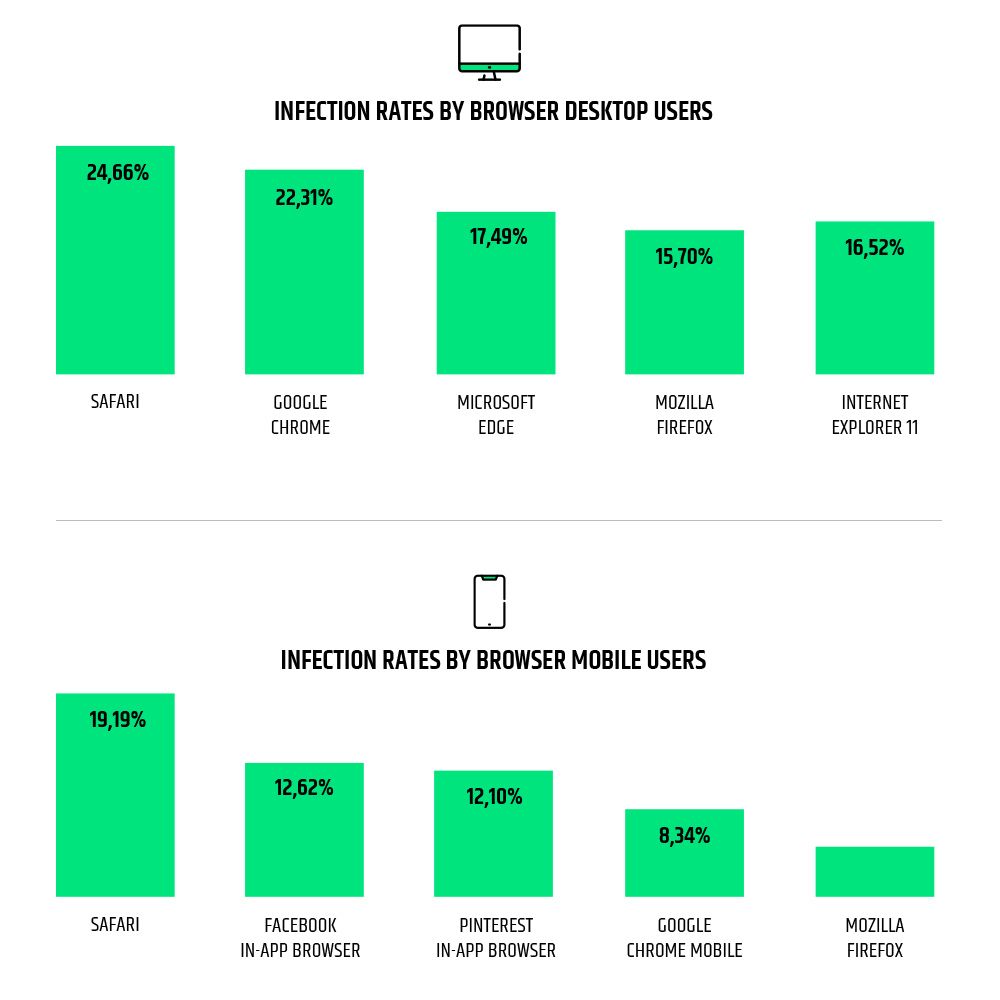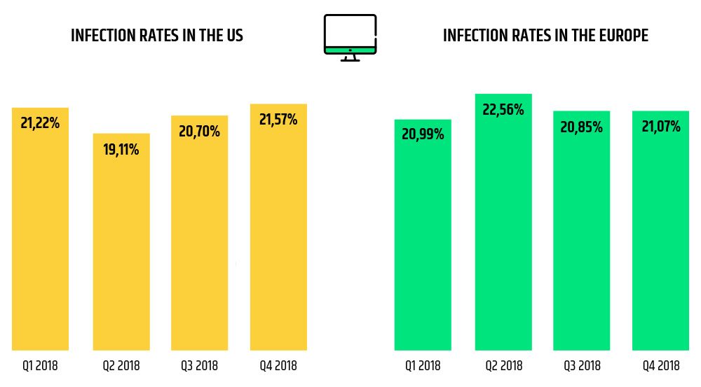 When we consider all major web browsers, Apple Safari users took the major blow for both desktop and mobile, with infection rates of 24.66% and 19.9% respectively. The desktop infection rate was the highest in the U.S. during the holiday season in Q4 at 21.57%, while in Europe the graph was the steepest during Q2 at 22.56%.