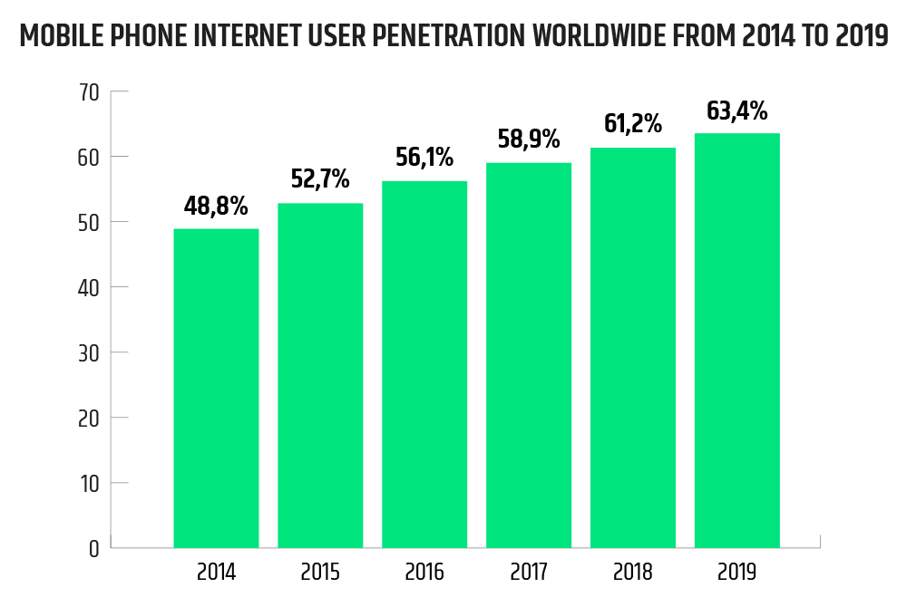Mobile is in pole-position as the go-to sales and marketing channel. According to Statista, 62% of global users access the internet by mobile phone. By 2020 the number of smartphone users is projected to reach 2.87 billion globally.