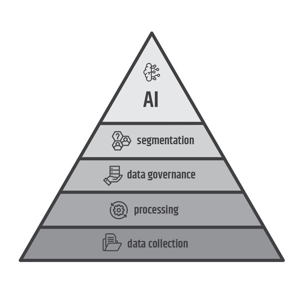 Large data sets constitute the foundation for the implementation of artificial intelligence. Jim Marous illustrates this problem in the form of the Maslow’s pyramid: with data collection featured as its foundation, the basis for all other activity. The next layers of the pyramid are data processing, data governance, segmentation, and then, at its apex, artificial intelligence. It is the large quantities of data that provide the algorithm with the material necessary for learning.