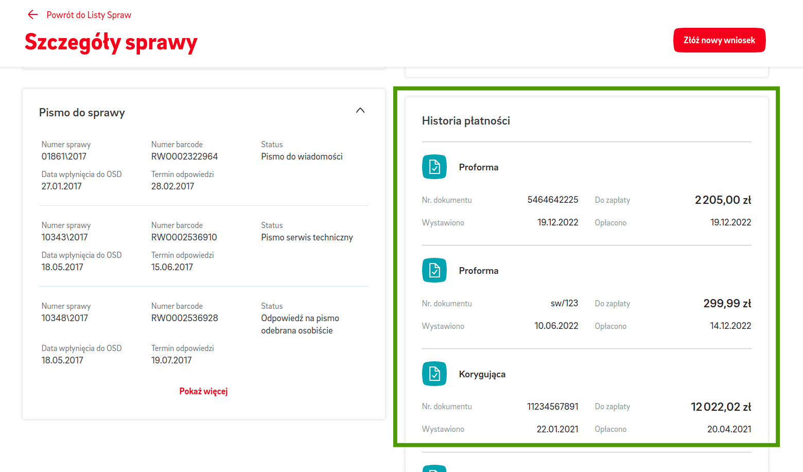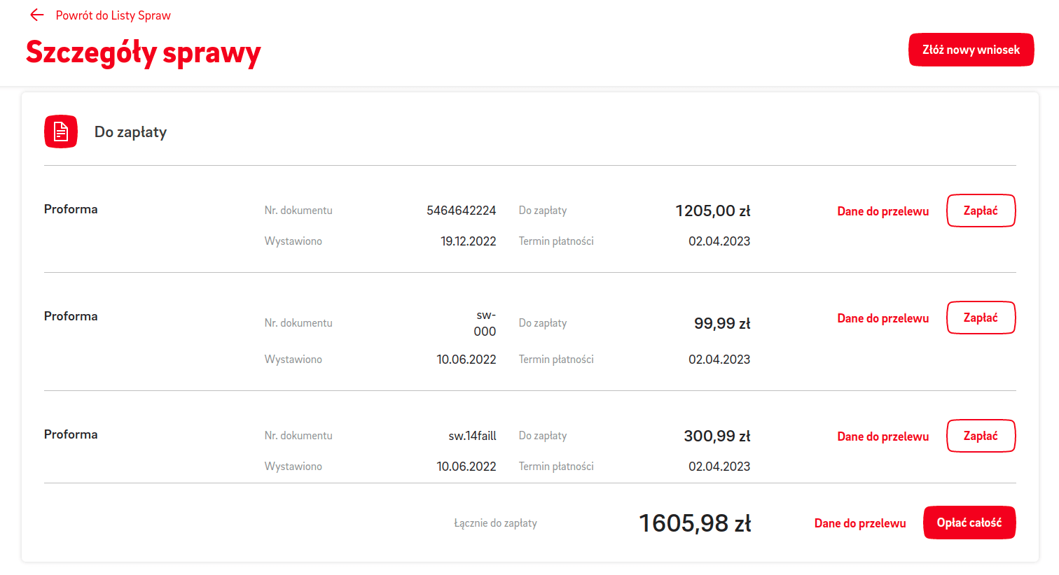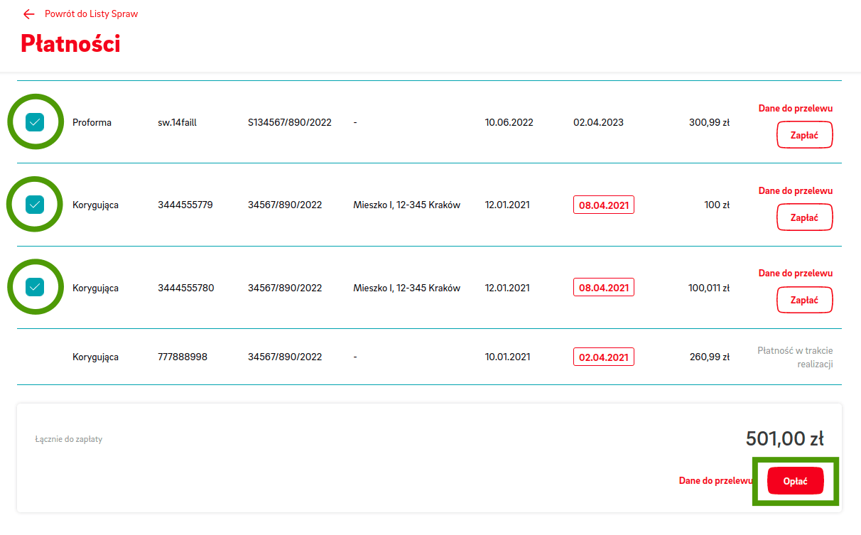 After logging-in and clicking on "Payments" in the top menu, the users will see a list of current and historical payments related to all their cases. Additionally, users may search, filter and sort payments according to their dates, type of problem or address.