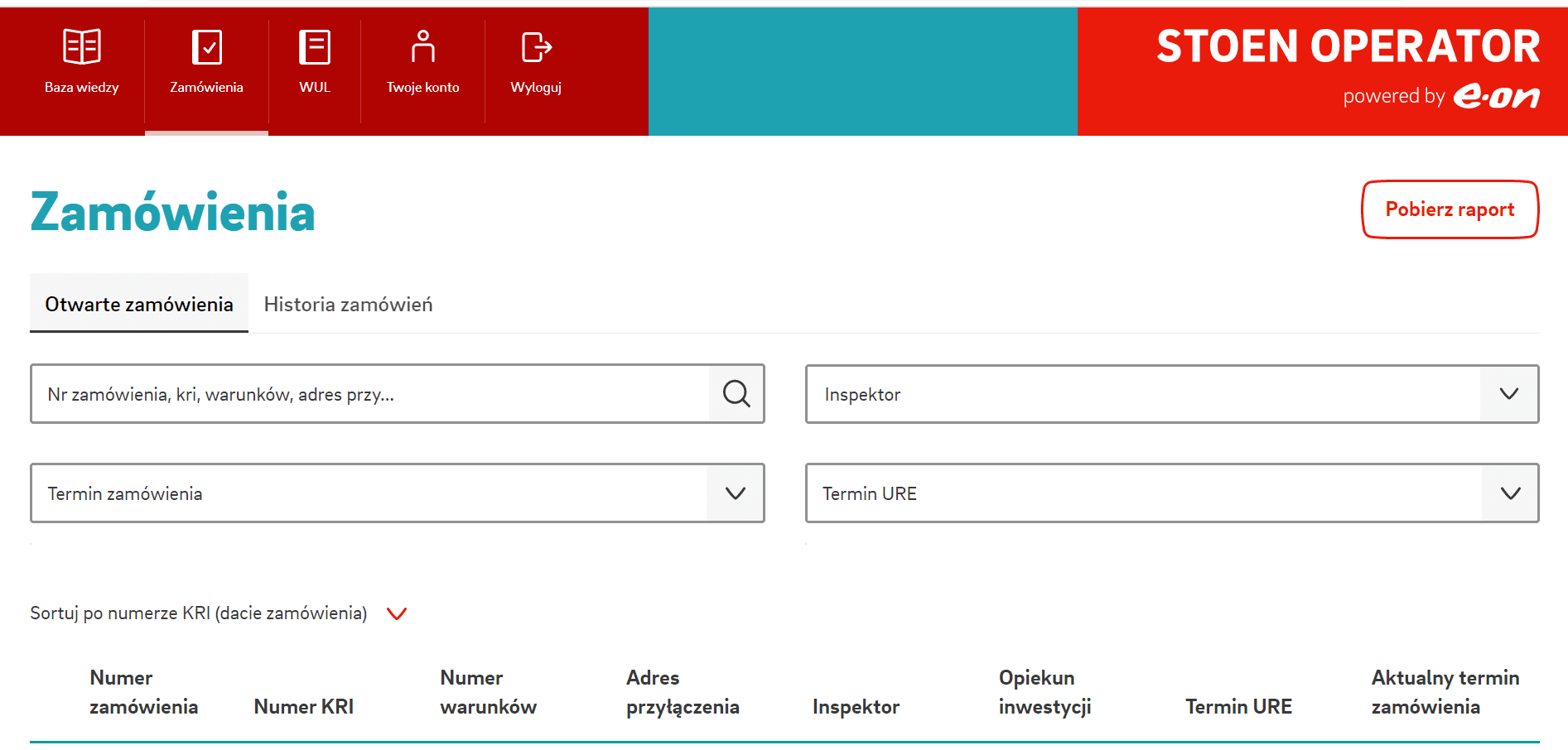 After logging-in, portal's interface will be displayed along with the list of orders assigned to a given logged-in contractor. Portal's interface consists of the main and top menu. The "knowledge base" will open an information portal of Stoen Operator in the new window, it contains all kinds of document templates - legal regulations, rules and regulations and other materials.