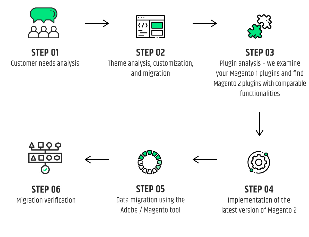 Migration from Magento 1 to Magento 2 is a complex process. That is why we take specific steps to ensure that it is carried out correctly: