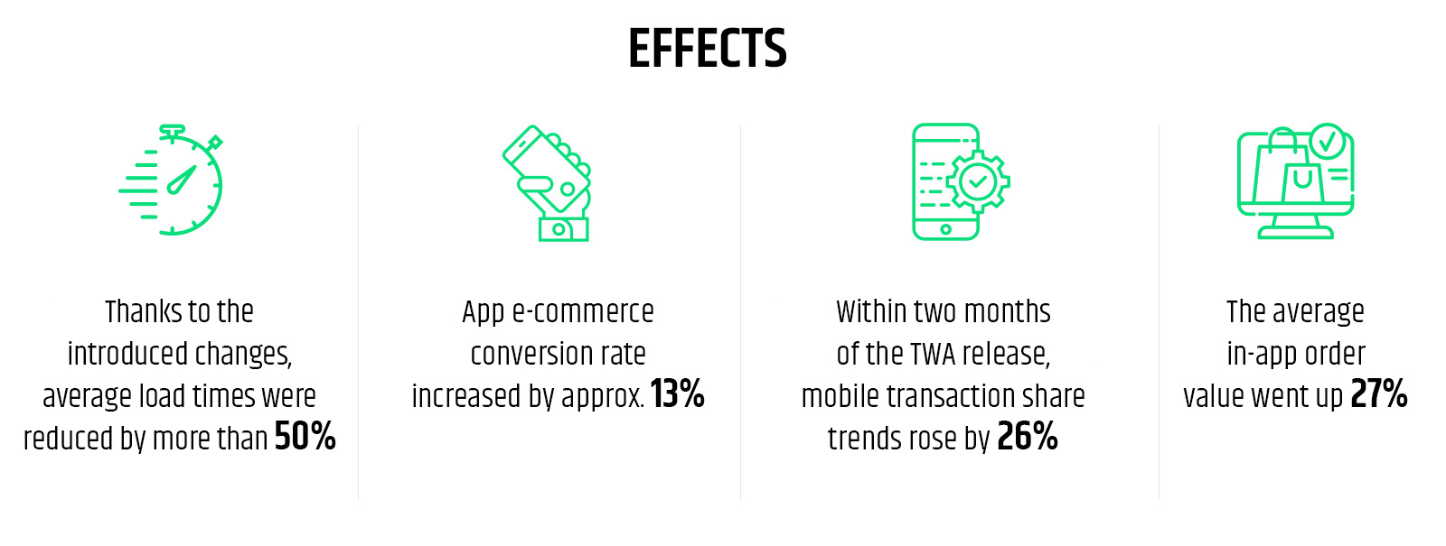 - Fast implementation. Transitioning to a TWA takes about 2 weeks – a much shorter time than is needed to develop a mobile app.